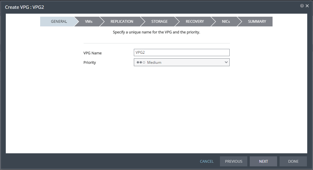 2. Specify the name of the VPG and the priority of the VPG.