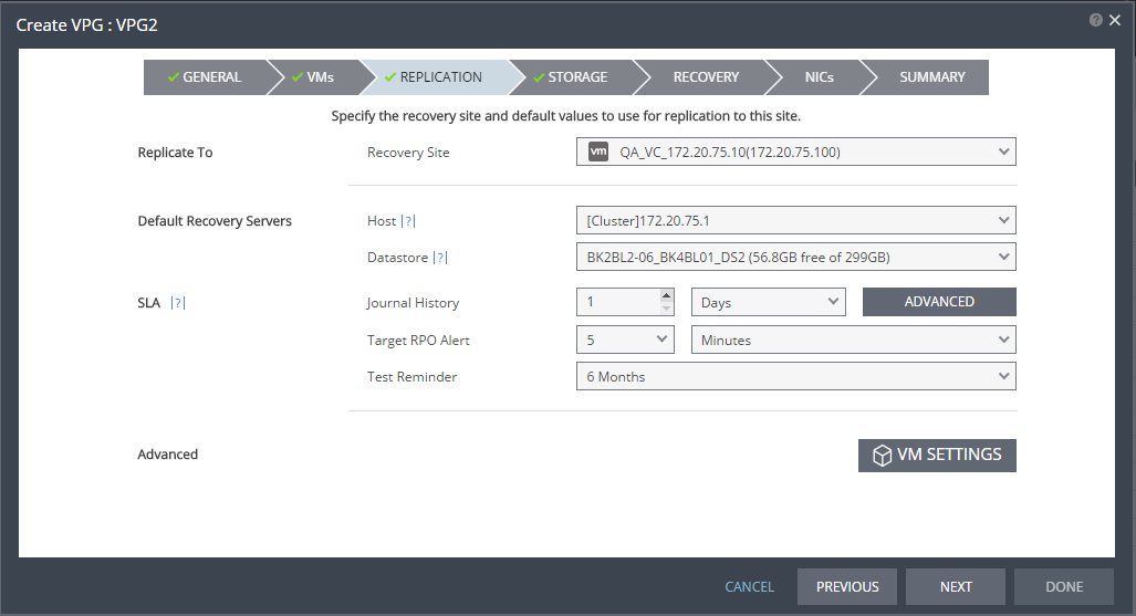 25. To specify a recovery folder for each virtual machine in the VPG, click VM SETTINGS.