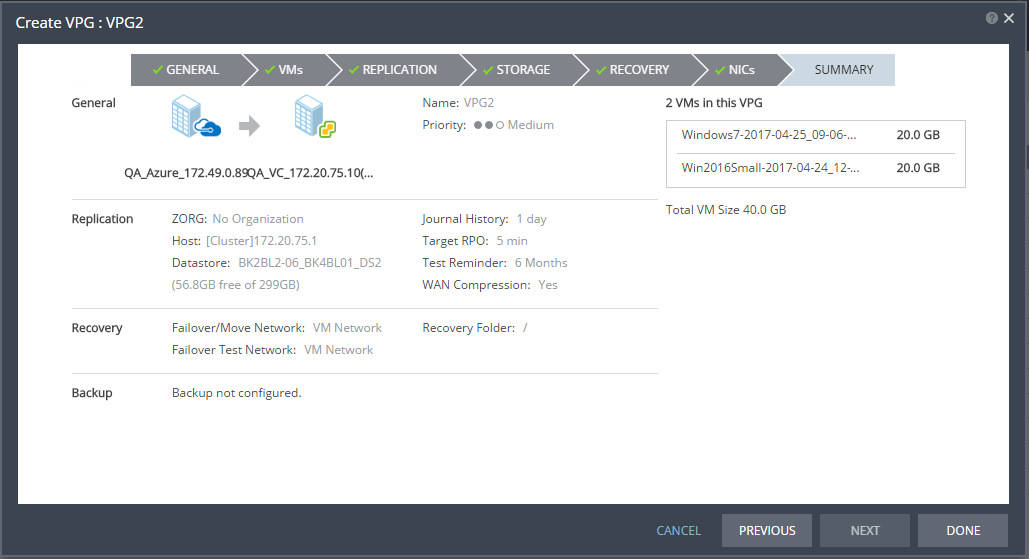 The SUMMARY step is displayed. It shows the VPG configuration that you defined in previous tabs.