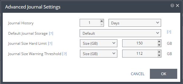 The size of the journal that triggers a warning that the journal is nearing its hard limit. | Unlimited: The size of the journal is unlimited and it can grow to the size of the recovery storage/datastore. If Unlimited is selected, Size and Percentage options are not displayed. |