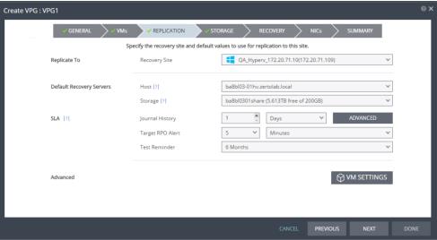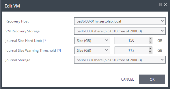 The storage/datastore used for the journal data for each virtual machine in the VPG. | (vSphere) To change the default, specify a host and then select one of the datastores accessible by this host to be used as the journal datastore. When you select specific journal datastore, the journals for each virtual machine in the VPG are stored in this datastore, regardless of where the recovery datastores are for each virtual machine. In this case, all the protected virtual machines must be recovered to hosts that can access the specified journal datastore. (Hyper-V) To change the default, specify a host and then select the storage location accessible by this host to be used as the journal storage. When you select specific journal storage, the journals for each virtual machine in the VPG are stored in this storage, regardless of where the recovery storage is for each virtual machine. In this case, all the protected virtual machines must be recovered to hosts that can access the specified journal storage. |