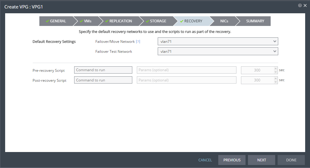Pre and post recovery scripts run in parallel. Therefore, ensure that the pre and post recovery scripts are not using common resources. |
