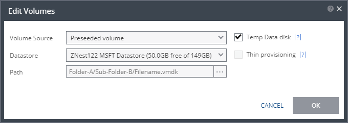 ■ (vSphere) Volume Source continued | Volume Source > Preseeded volume: Select this when you want to copy the protected data to a virtual disk in the recovery site. ![]() Consider the following, then proceed to define the Datastore and the Path: ■ Zerto recommends using this option particularly for large disks so that the initial synchronization is faster since a Delta Sync can be used to synchronize any changes written to the recovery site after the creation of the preseeded disk. ■ If a preseeded disk is not selected, the initial synchronization phase must copy the whole disk over the WAN. ■ If you use a preseeded virtual disk, you select the datastore and exact location, folder, and name of the preseeded disk, which cannot be an IDE disk. Zerto Virtual Replication takes ownership of the preseeded disk, moving it from its source folder to the folder used by the VRA. ■ The datastore where the preseeded disk is placed is also used as the recovery datastore for the replicated data. ■ If the preseeded disk is greater than 1TB on NFS storage, the VPG creation might fail. This is a known VMware problem when the NFS client does not wait for sufficient time for the NFS storage array to initialize the virtual disk after the RPC parameter of the NFS client times out. The timeout default value is 10 seconds. See VMware documentation, http://kb.vmware.com/selfservice/microsites/search.do?language=en_US&cmd=displayKC&externalId=1027919, which describes the configuration option to tune the RPC timeout parameter by using the command: esxcfg-advcfg -s <Timeout> /NFS/SetAttrRPCTimeout ■ If the protected disks are non-default geometry, configure the VPG using preseeded volumes. ■ If the protected disk is an RDM disk, it can be used to preseed to a recovery VMDK disk. Zerto Virtual Replication makes sure that the VMDK disk size is a correct match for the RDM disk. ■ If the VPG is being defined for a Zerto Organization, ZORG, the location of the preseeded disk must be defined in the Zerto Cloud Manager. See Zerto Cloud Manager Administration Guide. Then, define the following: ■ Datastore: The Datastore where the preseeded disk is located. Only disks with the same size as the protected disk can be selected when browsing for a preseeded disk. ■ Path: The full path to the preseeded disk. |