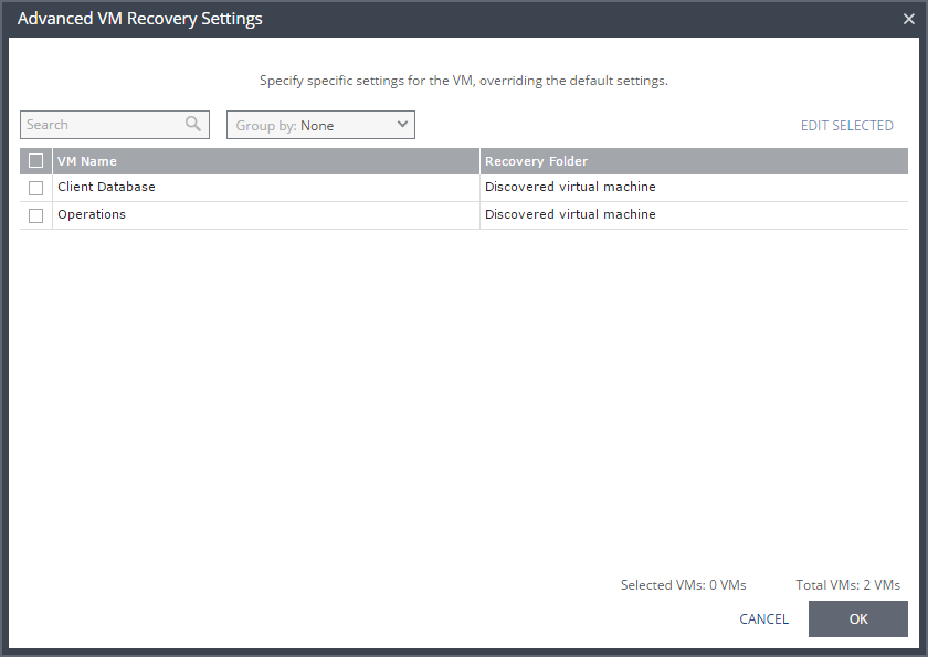 Displays the recovery settings for the virtual machines in the VPG. You can choose to edit information in one field by clicking the field and updating the information. You can choose to edit information for several virtual machines at the same time by selecting the virtual machines and clicking EDIT SELECTED.