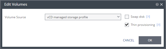 vCD managed storage profile – The datastore is allocated based on the available free space. You can specify whether the recovery volume is thin-provisioned or not. If the Org vDC only supports thin-provisioned volumes, you cannot change the setting.