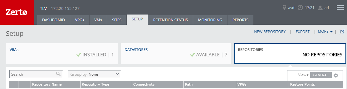 1. In the Zerto User Interface, click SETUP > REPOSITORIES > NEW REPOSITORY.