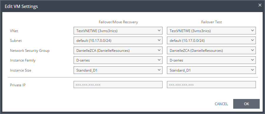 Edit the network settings for one or more virtual machines in a VPG that will be recovered to Azure. There are recovery settings for failovers and moves, and for failover tests.