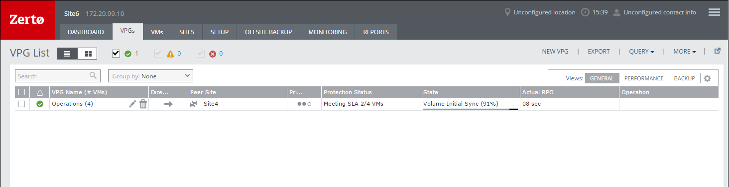After the VPG definition has been updated, the protected and recovery sites are then synchronized. During the synchronization period, the Protection Status displayed in the VPGs tab of the Zerto User Interface is: Meeting SLA n/m VMs where n is the number of virtual machines that were originally in the VPG, and m is the total number of virtual machines in the VPG, including the virtual machines that are currently being synced. While the virtual machines that were added are being synced, the VPG can be failed over but the failover only includes the original virtual machines in the VPG.