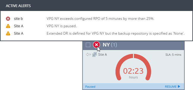 ■ Alert status indicator: The color indicates the status of the VPG. Hovering over the alert displays a popup of all active alerts with descriptions: