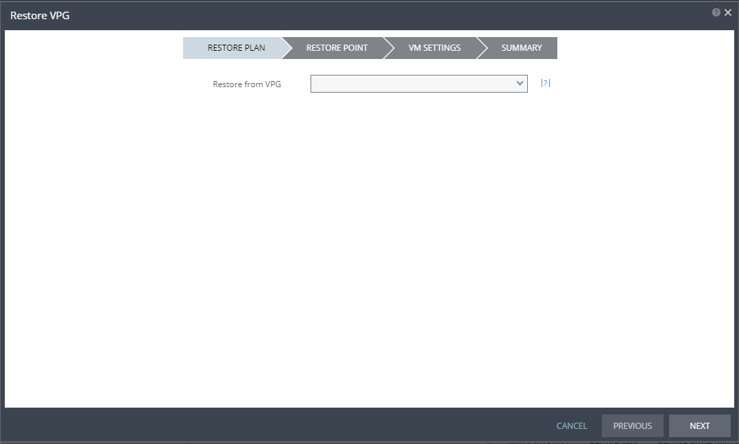 1. In the Zerto User Interface select ACTIONS > RESTORE VPG.