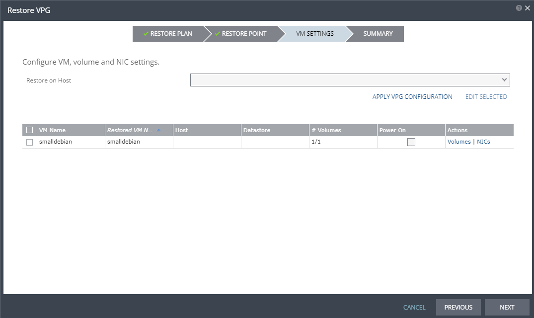 Alternatively, you can use the recovery host and storage specified for each virtual machine in the VPG definition by clicking APPLY VPG CONFIGURATION.