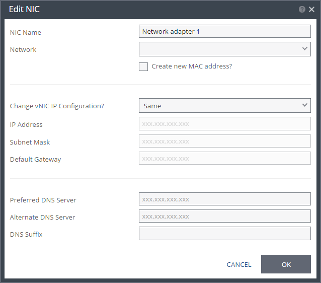 ■ Change vNIC IP Configuration: | Whether or not to keep the default virtual NIC (vNIC) IP configuration. You can only change the vNIC IP after the restore has completed with VMware Tools installed. ■ If you select a static IP connection, you must set the IP address, subnet mask, and default gateway. Optionally, change the preferred and alternate DNS server IPs and the DNS suffix. ■ If you select DHCP, the IP configuration and DNS server configurations are assigned automatically, to match the protected virtual machine. You can change the DNS suffix. |