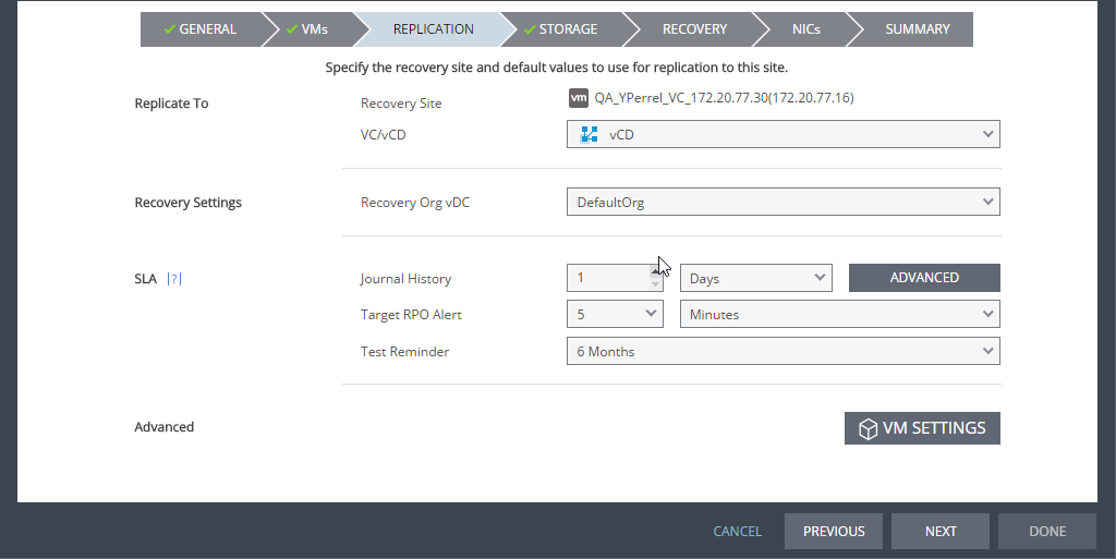 The REPLICATION step is re-displayed, displaying additional fields relevant for vCD.