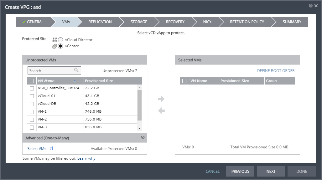 Note: Virtual machines can be protected in a maximum of three VPGs. These VPGs cannot be recovered to the same site. Virtual machines protected in the maximum number of VPGs are not displayed in the Select VMs dialog.