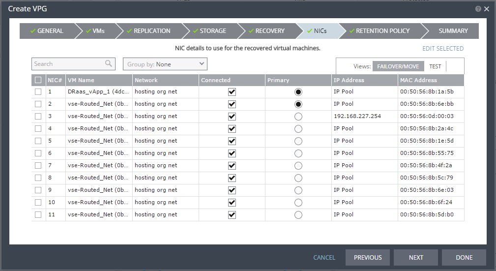 40. Specify the network details to use for the recovered virtual machines after a failover or move operation, in the Failover/Move column, and for the recovered virtual machines when testing replication, in the Test column.