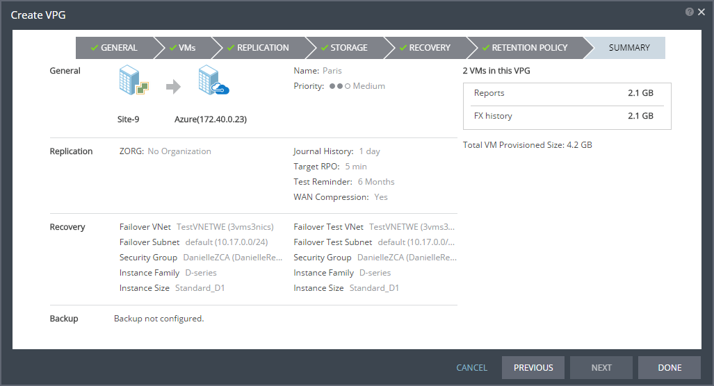 The SUMMARY step is displayed. It shows the VPG configuration that you defined in the previous steps.