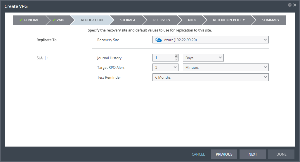 Note: Steps that do not require input are marked with a check mark. You can jump directly to a step that has been marked with a check mark to edit the values for that step. Every step must be marked with a check mark before you can click DONE to create the VPG.