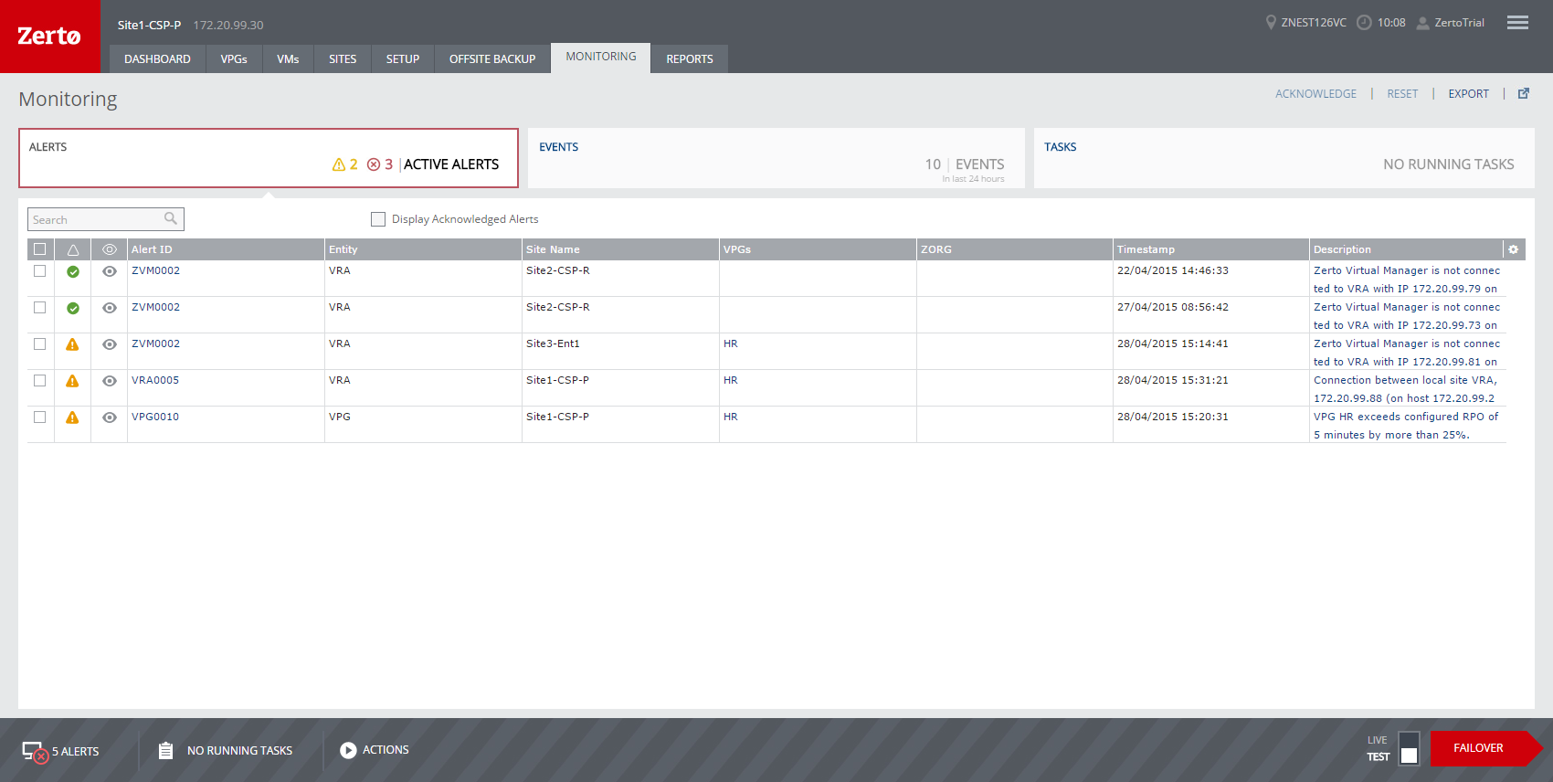 All alerts issued by Zerto Virtual Replication are displayed in the Zerto User Interface. An alert status indicator is displayed in the top left of the display and specific details of all issued alerts are displayed in the ALERTS tab under the top MONITORING tab.