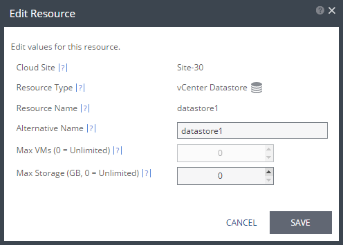 This dialog is specific for the type of resource selected to be edited. For example, editing a datastore enables changing the name of the datastore that is displayed to the customer and specifying the maximum amount of storage that can be recovered with this datastore. Editing a network enables changing the network name that is displayed to the customer. Editing a resource pool enables changing the resource pool name that is displayed to the customer and specifying the maximum number of virtual machines that can be protected to the resource pool.
