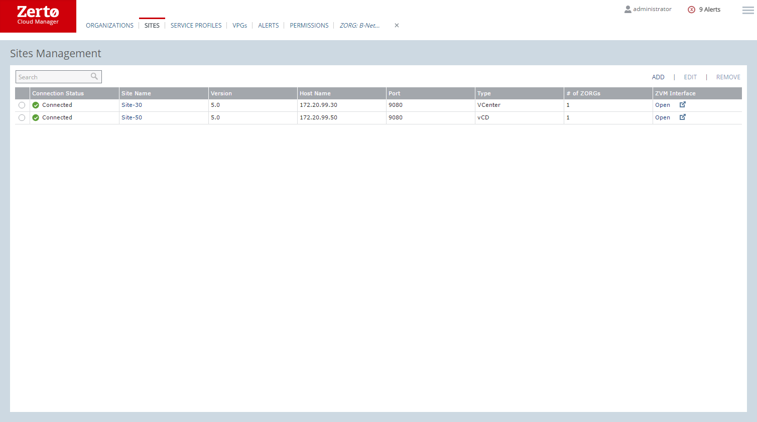 ■ Type: Whether the Zerto Virtual Manager communicates with vCloud Director or only a vCenter Server.