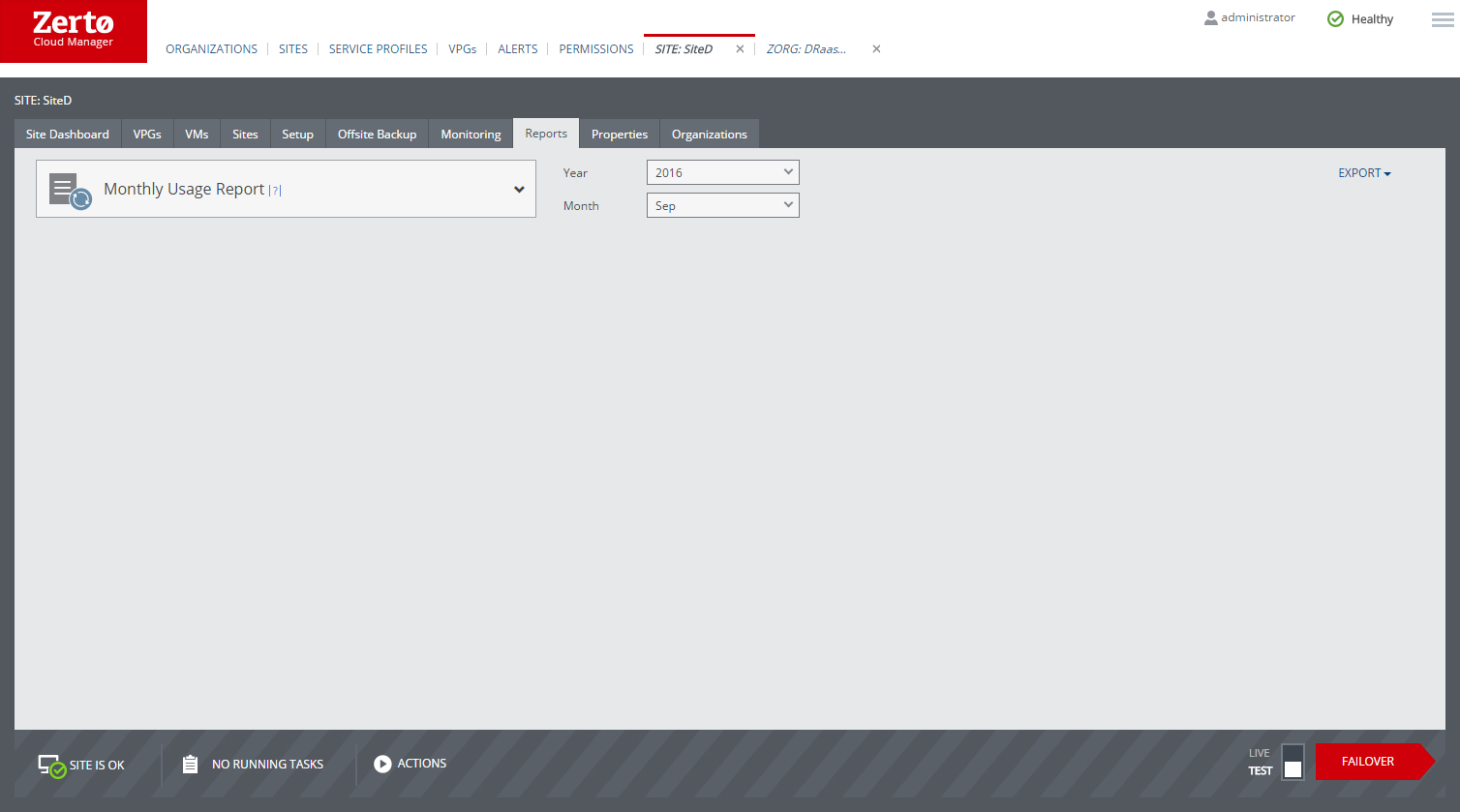 For each month, the usage report displays the number of virtual machines protected during the month and the average number per day in the month. For example, if fifteen virtual machines are protected in a few VPGs starting on the 28th of the month in a thirty day month, the total days will be 30 (two days multiplied by fifteen machines) and the VM Count will be 1 (Total days divided by the number of days in the month).