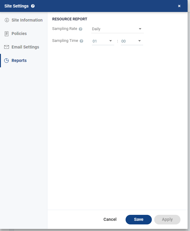 Specify when you want to take resource samples to identify resource usage, either daily at a specific hour and minute or hourly at a specific minute within each hour.