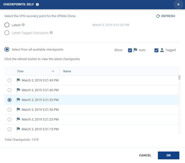 Latest: The clone is to the latest checkpoint. This ensures that the data is crash-consistent for the clone. When selecting the latest checkpoint, the checkpoint used is the latest at this point. If a checkpoint is added between this point and starting the clone, the later checkpoint is not used.