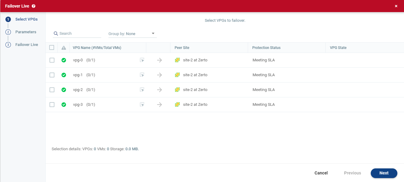 2. Select the VPGs to failover. By default, all VPGs are listed.