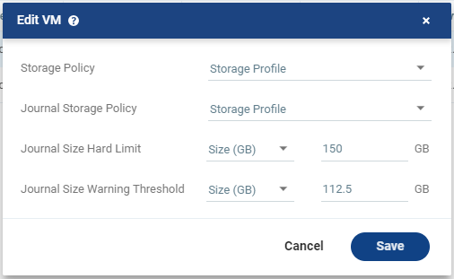 The size of the journal that triggers a warning that the journal is nearing its hard limit. | Unlimited: The size of the journal is unlimited and it can grow to the size of the recovery storage/datastore. If Unlimited is selected, Size and Percentage options are not displayed. |