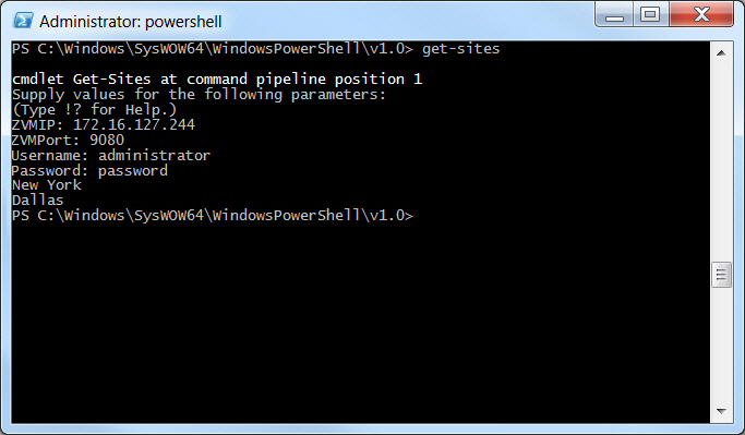 The Get-Sites cmdlet completes, returning the list of sites paired with the site where the specified Zerto Virtual Manager runs.