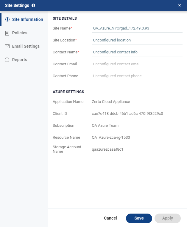 The Site Settings dialog enables configuring various site settings. These include the default script timeout and protection policies such as the commit policy for a failover or move operation.
