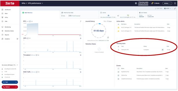 A new tab is added to the Zerto User Interface, with the name of the VPG that you clicked. The tab displays data about the VPG.