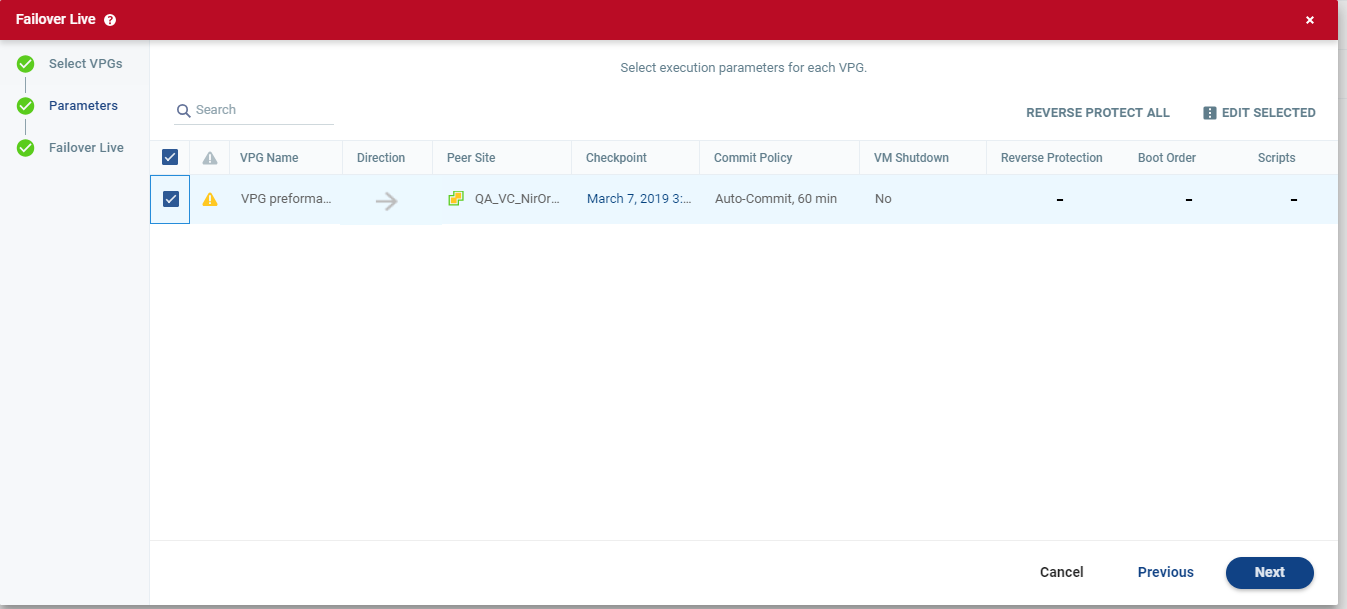 Note: Selecting specific VMs in a VPG to failover is not supported when replicating from a vCD site.