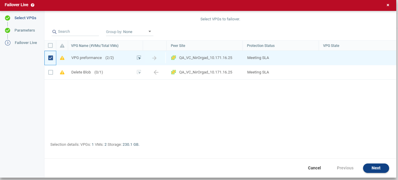 2. Select the VPGs to failover. By default, all VPGs are listed.