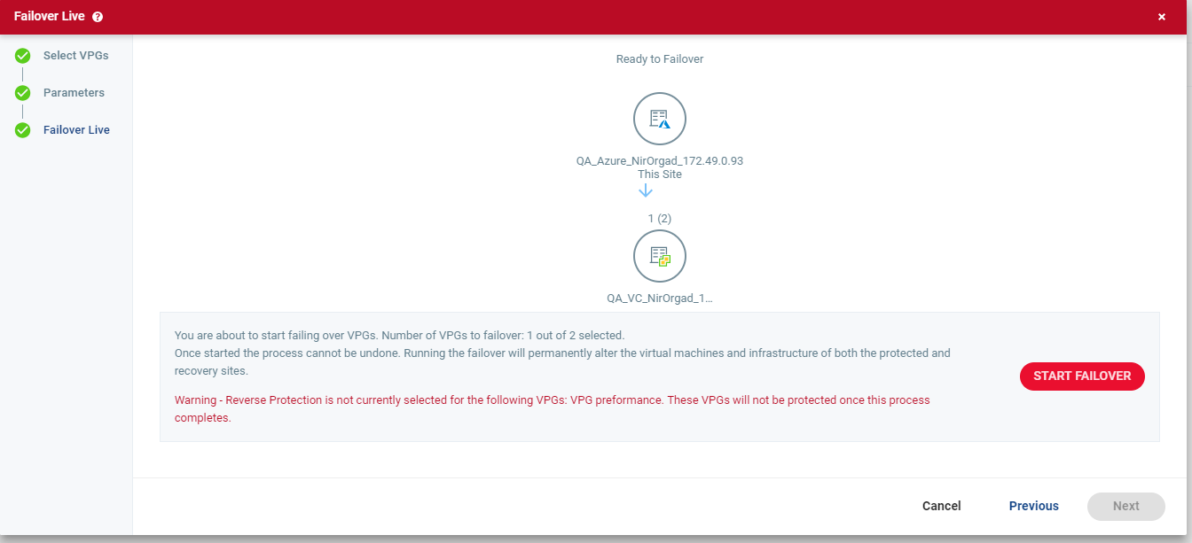 Note: If any of the VPGs have at least one VM configured with a static IP, but the static IP is in use on the recovery site, a warning message appears enabling you to choose whether to continue with a dynamic IP, or to cancel the failover process.