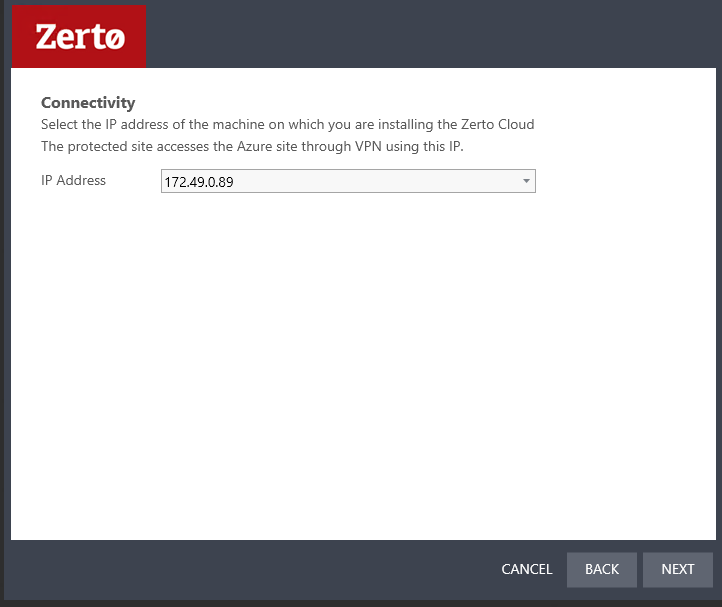 8. Select the IP Address of the machine on which you are installing the Zerto Cloud Appliance. The protected site accesses the Azure site through VPN using this IP.