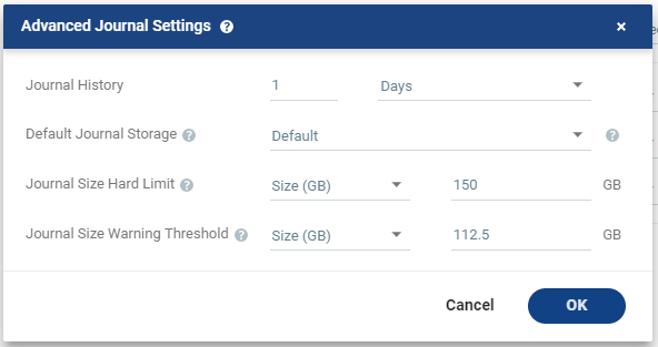 The size of the journal that triggers a warning that the journal is nearing its hard limit. | Unlimited: The size of the journal is unlimited and it can grow to the size of the recovery storage/datastore. If Unlimited is selected, Size and Percentage options are not displayed. |