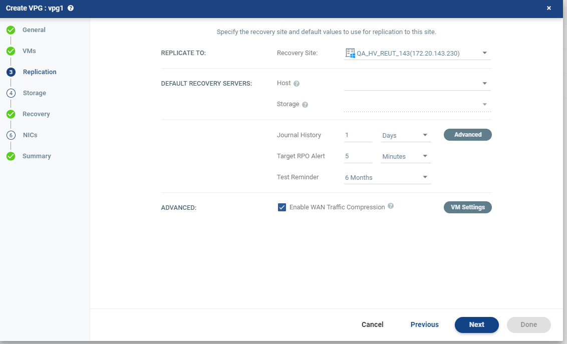 The storage/datastore used for the journal data for each virtual machine in the VPG. | (vSphere) To change the default, specify a host and then select one of the datastores accessible by this host to be used as the journal datastore. When you select specific journal datastore, the journals for each virtual machine in the VPG are stored in this datastore, regardless of where the recovery datastores are for each virtual machine. In this case, all the protected virtual machines must be recovered to hosts that can access the specified journal datastore. (Hyper-V) To change the default, specify a host and then select the storage location accessible by this host to be used as the journal storage. When you select specific journal storage, the journals for each virtual machine in the VPG are stored in this storage, regardless of where the recovery storage is for each virtual machine. In this case, all the protected virtual machines must be recovered to hosts that can access the specified journal storage. |