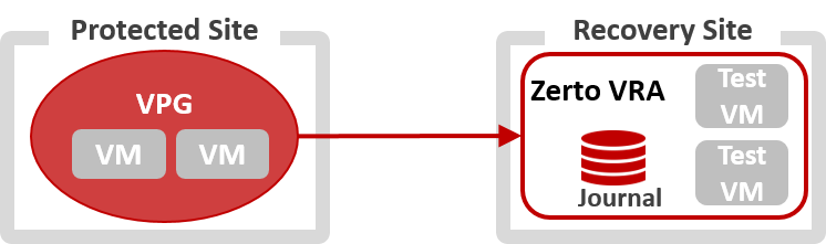 The Failover Test operation creates test virtual machines in a sandbox, using the test network specified in the VPG definition, as opposed to a production network, to a specified point-in-time, using the recovery disks and journal in the storage account, managed by the VRA. For more information see