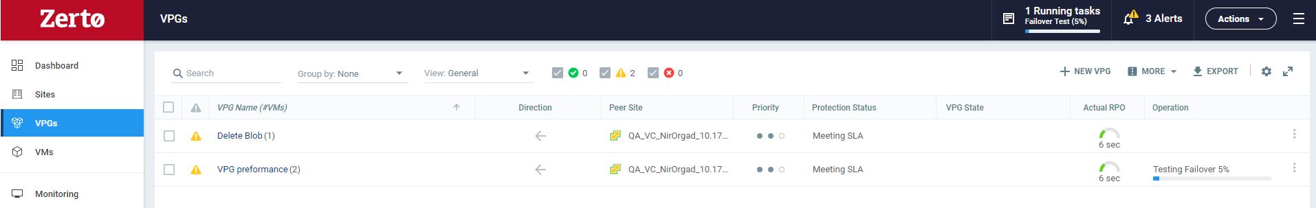■ In the Zerto User Interface, click the VPGs tab. The Operation field in the GENERAL view displays Testing Failover when a failover test is being performed.