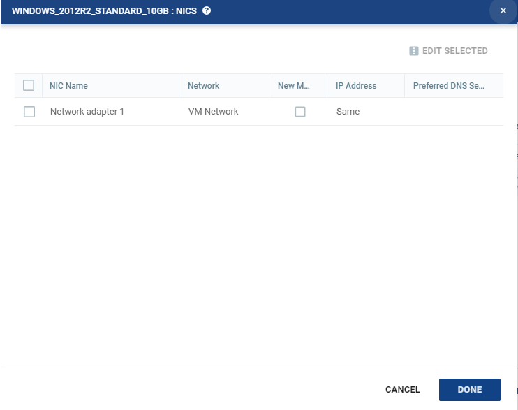 When restoring a retention set to the recovery site, this dialog shows the NIC settings for the virtual machines in the VPG. You can choose to edit information in one field by clicking the field and updating the information. You can choose to edit the NIC settings for several virtual machines at the same time by selecting the NICs and clicking EDIT SELECTED.