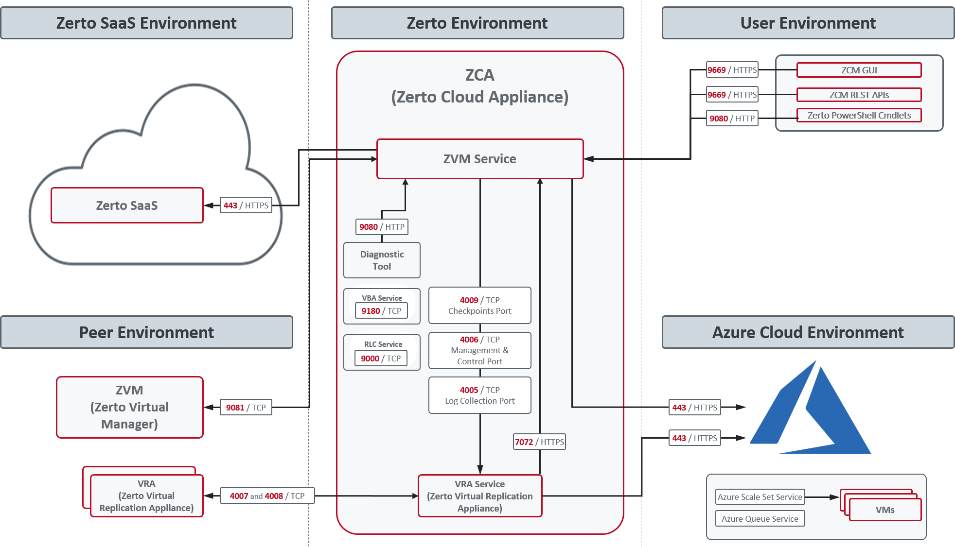 443 | ■ Required between the ZVM and the Azure Cloud environment. ■ Required between the Azure REST Service and the ZVM during installation of a VRA. ■ Required for communication between the ZVM and Azure Scale Set and Queues services. |