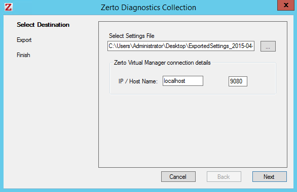 3. Select the destination for the file that will contain the exported settings and enter the Zerto Virtual Manager IP address and port for the protected site.