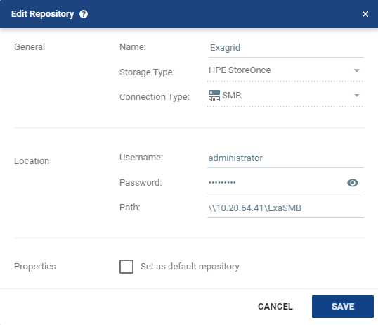 Set as default repository: Select to use the Repository as the default when defining the retention policy in a VPG.