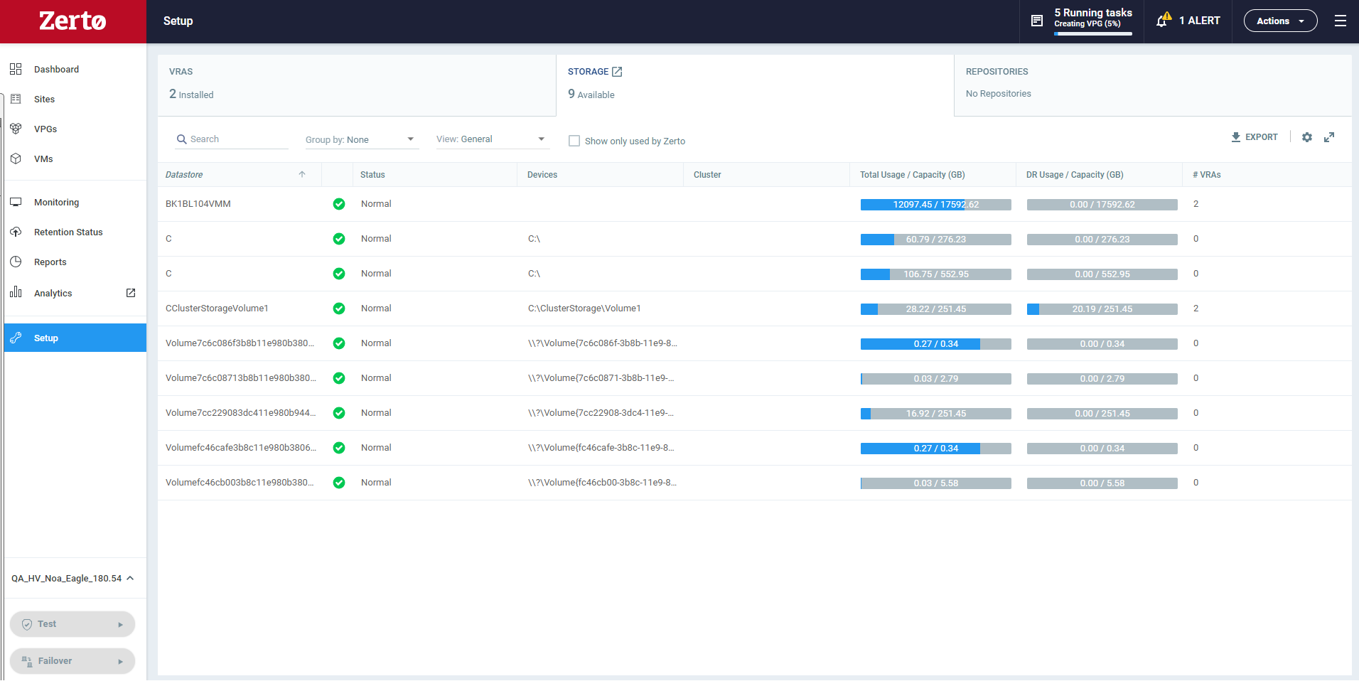 DR Usage (GB): The amount of GB used by Zerto in relation to the total amount available.