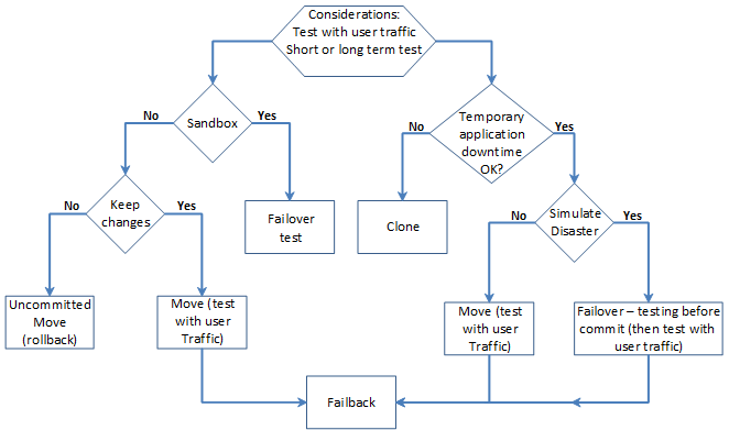 If you want to perform a live DR test that includes a simulated disaster you can simulate the disaster, for example, by disconnecting the network between the two sites. In this type of test, once the disaster is simulated a Move operation cannot be used, since it requires both sites to be healthy, while a Failover operation can be used.