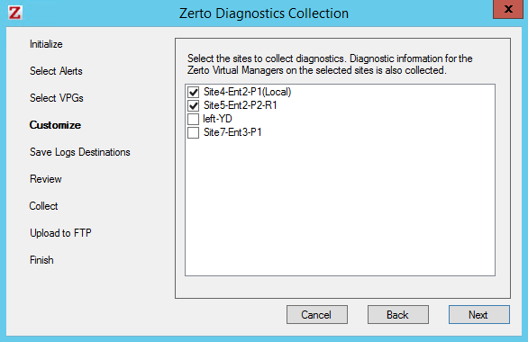 Note: Zerto Virtual Manager logs from both sites are collected when both sites are trusted sites otherwise only logs from the local site are collected.