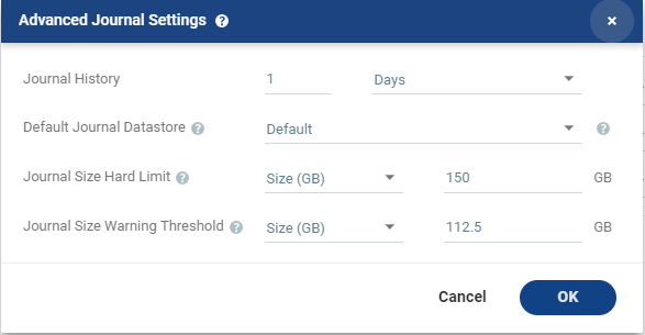 The size of the journal that triggers a warning that the journal is nearing its hard limit. | Unlimited: The size of the journal is unlimited and it can grow to the size of the recovery storage/datastore. If Unlimited is selected, Size and Percentage options are not displayed. |