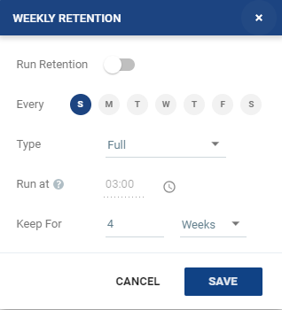 ■ Keep for: Define the number of weeks to keep the Weekly retentions. A rotation of the retention process will be performed to enforce the predefined retention. | |