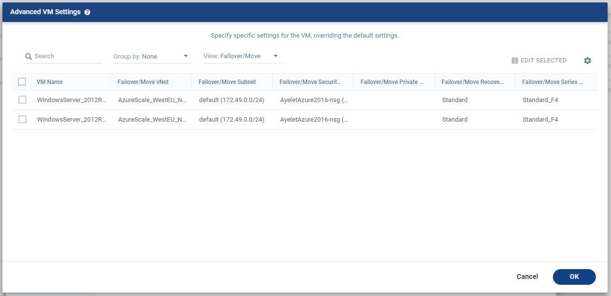 Displays the recovery settings for the virtual machines in the VPG. You can choose to edit information in one field by clicking the field and updating the information. You can choose to edit information for several virtual machines at the same time by selecting the virtual machines and clicking EDIT SELECTED.